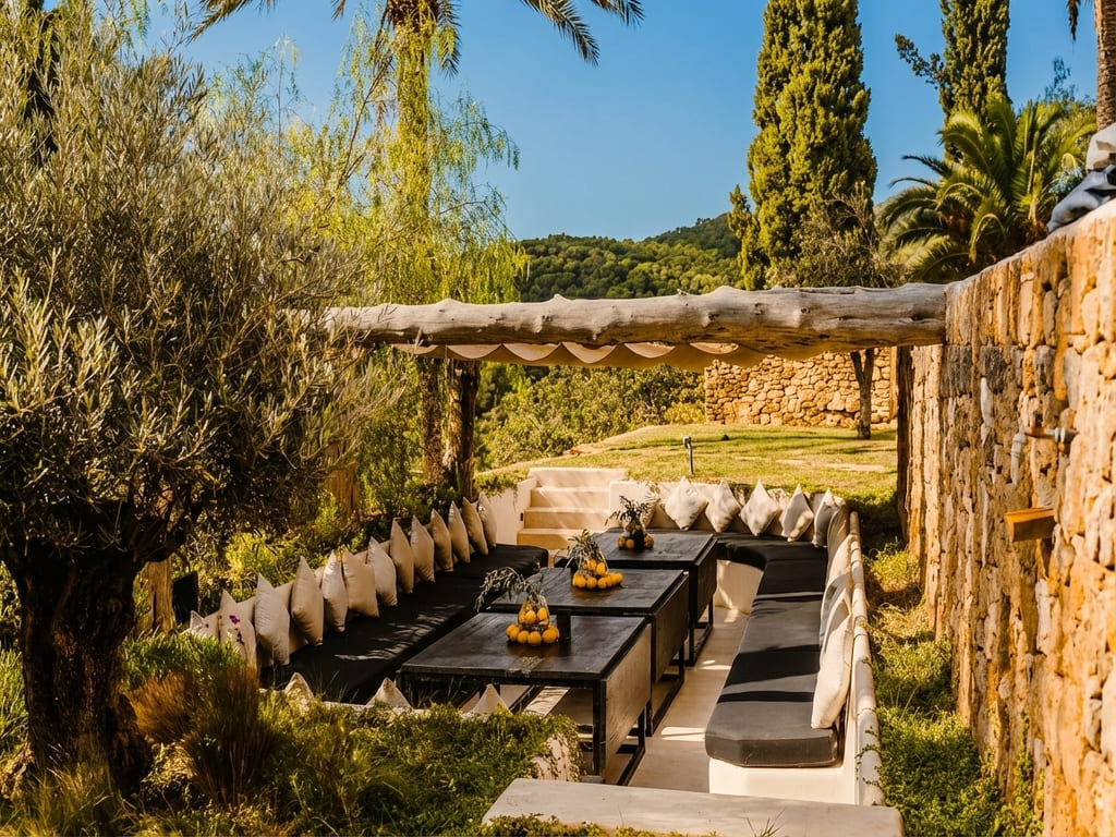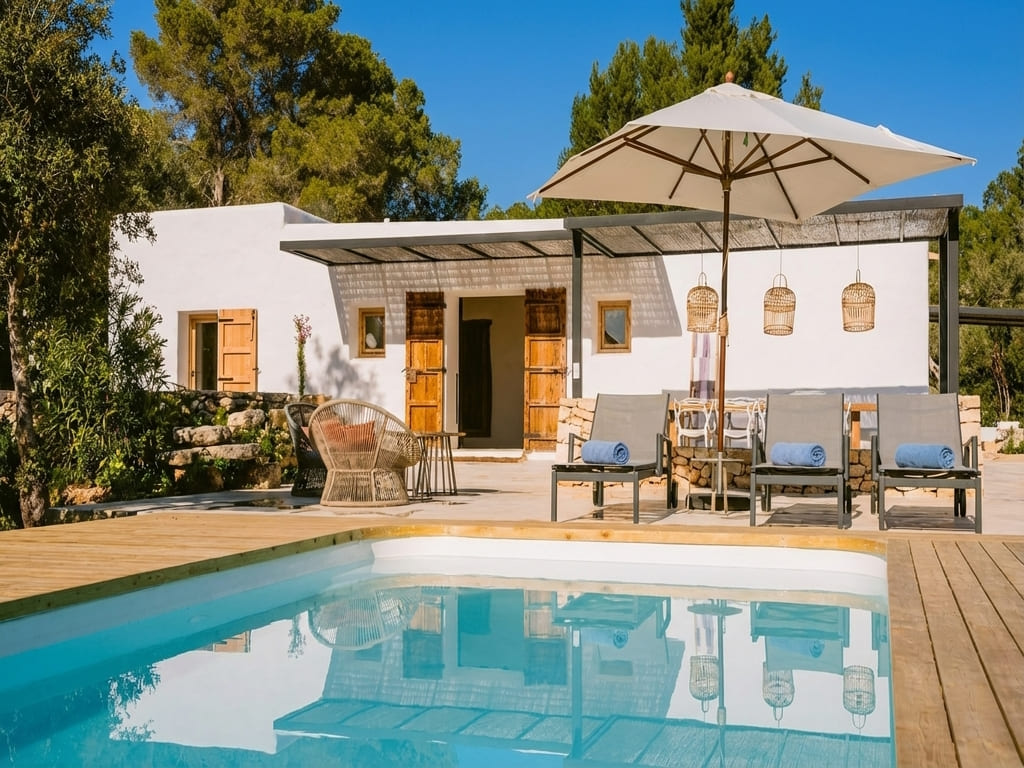 Can Pep Sa Guaita is a villa with a traditional style, modernized and located in a privileged environment near Ibiza Town. Its large outdoor spaces, with a vast pool and relaxation areas, make it the ideal place to unwind after a day of shopping and exploration. With a cozy yet elegant atmosphere, Can Pep Sa Guaita is perfect for families or groups of friends who want to enjoy the island to its fullest.