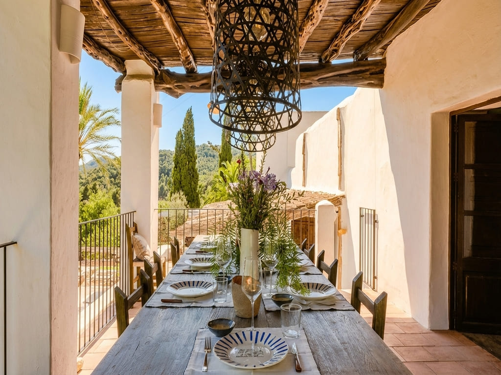 Can Pep Sa Guaita is a traditional Ibizan villa surrounded by nature, offering stunning views and a peaceful atmosphere. Its rustic charm is balanced with modern comforts, making it both authentic and inviting.