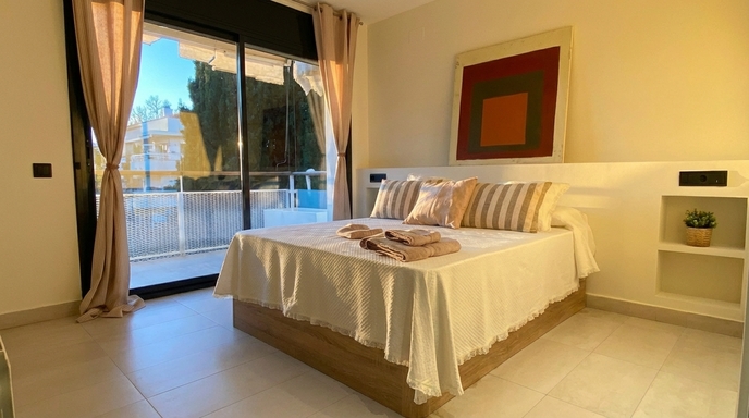 Located in a quiet residential area just minutes from the beach, La Pedra is the perfect apartment for those seeking comfort, privacy and proximity to the sea. Its practical layout includes a bright living room with access to a terrace, an independent kitchen, two double bedrooms, two full bathrooms and a guest toilet. On the upper floor, there’s a terrace with a chill-out area and pergola—ideal for enjoying the Mediterranean climate. All within a well-maintained setting that includes a communal pool, garden and private parking.