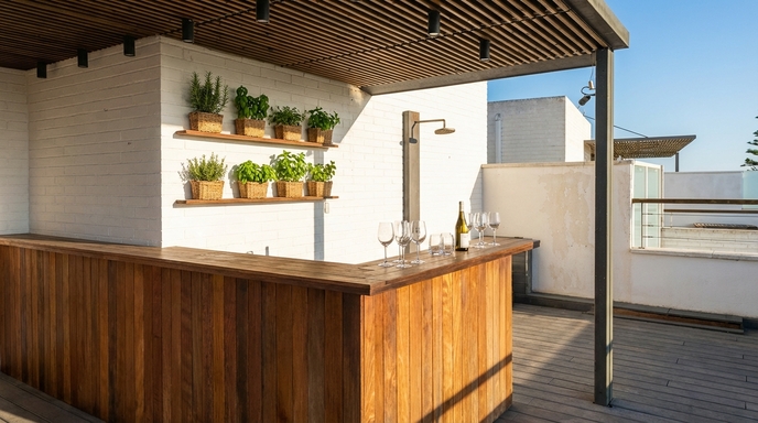 Rooftop terrace (private or shared?): Spacious solarium with open views and a shaded chill-out pergola, ideal for sunbathing, relaxing or al fresco dining.