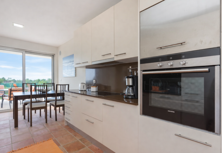 The fully equipped kitchen allows guests to enjoy both casual meals and long shared dinners. Outdoors, the villa stands out for its private saltwater swimming pool (10 x 5 m), large furnished terraces, relaxation areas and a built-in barbecue, ideal for al fresco dining.