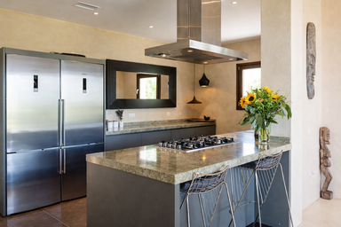 Fully equipped open-plan kitchen: refrigerator, freezer, microwave, oven, stovetop, toaster, and dishwasher.