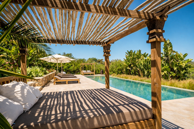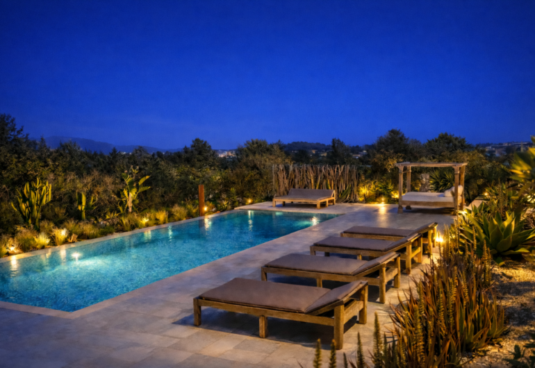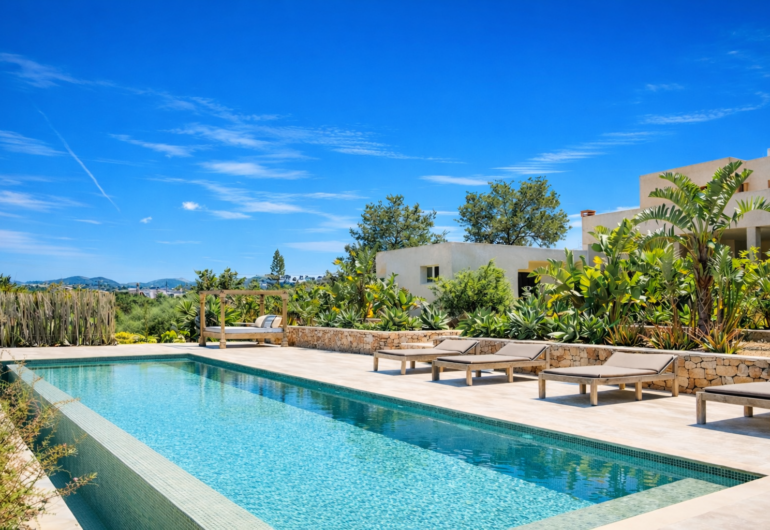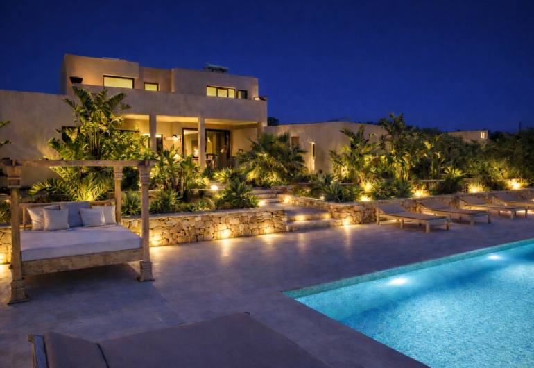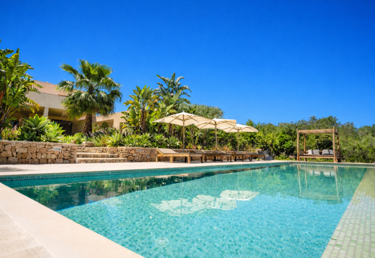 A luxury holiday villa in Ibiza with pool in a natural setting like this turns every moment into a sensory experience: sunrise breakfasts, sun-filled afternoons by the pool, peaceful naps beneath the trees, and unforgettable dinners under a starry sky.