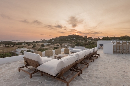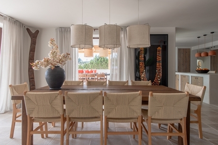 Designed as a true haven for relaxation, the villa blends the essence of boho-Ibizan style with elegant contemporary design, creating spacious, bright and harmonious living areas. Every detail has been carefully considered to enhance wellbeing, from the seamless flow between indoor and outdoor spaces to the use of natural materials and refined textures. More than just a stay, this luxury holliday villa rental in Ibiza is an experience lived with calm, authenticity and a constant sense of exclusivity, where every moment invites you to slow down, reconnect and enjoy luxury in its most serene form.