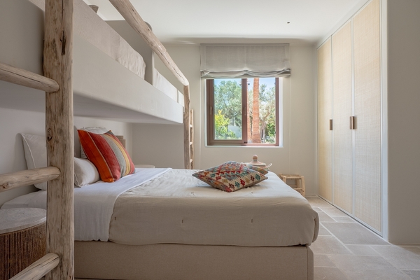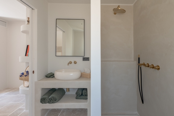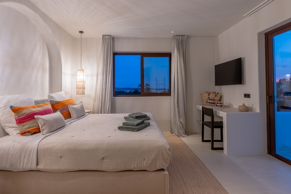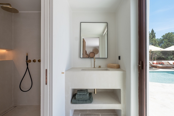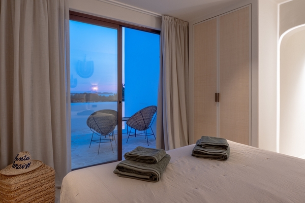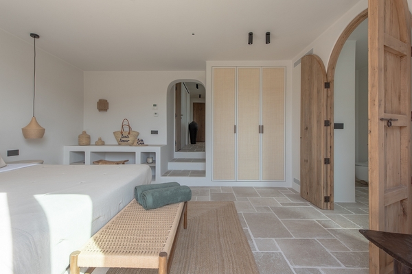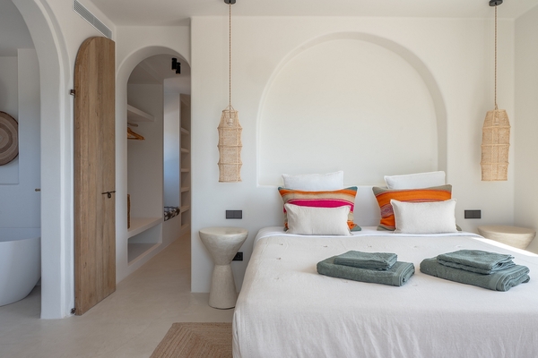 Villa Serenity’s architecture blends boho-Ibizan character with a contemporary, elegant and highly functional design. Spacious rooms, large windows and a carefully planned layout allow natural light to flood the villa throughout the day, creating a warm and refined ambience. Every corner has been designed with wellbeing in mind, incorporating noble materials, natural textures and a timeless aesthetic that invites you to unwind and reconnect.