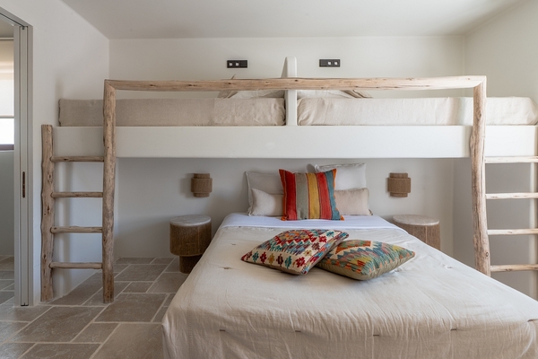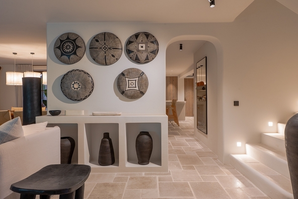 The interiors offer the highest level of comfort and exclusivity. Six double bedrooms with en-suite bathrooms ensure privacy and intimacy, featuring premium bedding, air conditioning and carefully selected handcrafted details. The bathrooms, elegant yet functional, combine local stone, spacious walk-in showers and freestanding bathtubs with views. The bright and expansive living room opens directly onto the outdoor areas and the pool, while the fully equipped open-plan designer kitchen is perfect for both relaxed family gatherings and refined culinary experiences.