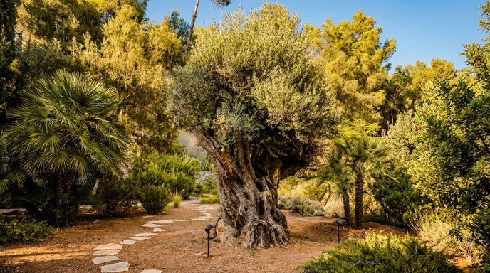 One of the villa’s greatest assets is its extraordinary garden, a living landscape rich in history and energy. Stone pathways, hidden corners and terraces seamlessly integrated into the surroundings weave through palm trees, olive groves and fruit trees. This green setting is not merely a backdrop, but a defining element of the villa’s identity.