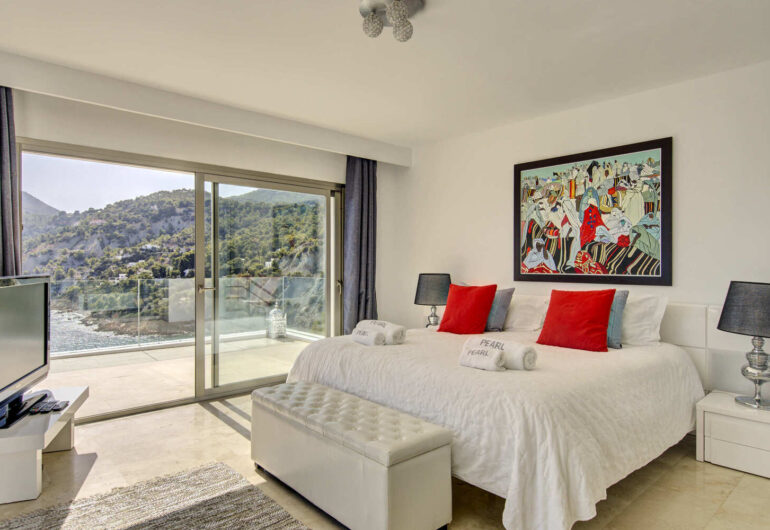 Inside, the villa stands out for its luminous and sophisticated design. Generous living spaces, floor-to-ceiling windows and a carefully curated selection of materials create an elegant yet welcoming ambiance. The six en-suite bedrooms ensure total privacy, while the elevated master suite, with panoramic coastal views, becomes a true sanctuary of rest. A fully equipped kitchen and dining areas, both indoors and outdoors, complete an experience designed for absolute comfort.