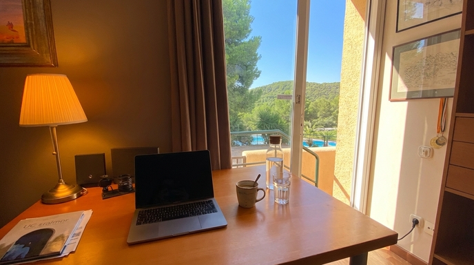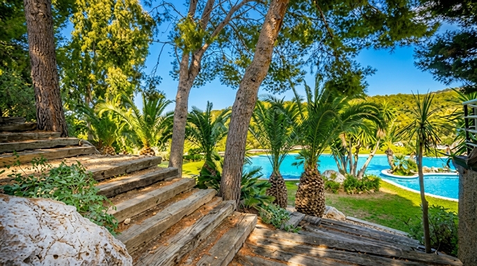 From some rooms, you can admire the blue Mediterranean, while others offer views of the natural park and the pool area, creating a constant sense of serenity.