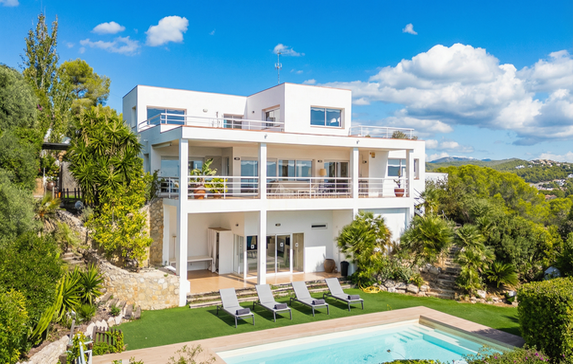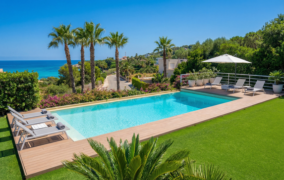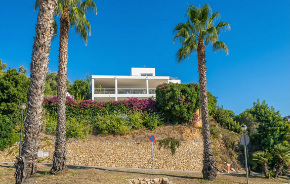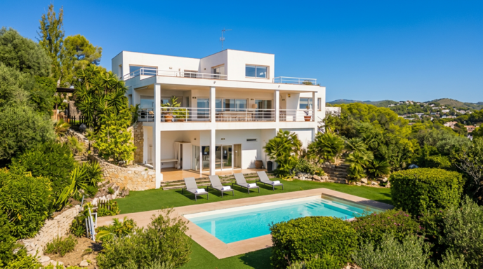 This independent villa stands out for its contemporary architecture, clean lines and outdoor spaces designed for total relaxation: a private pool with views, a garden full of palm trees, a chill-out area and terraces overlooking the sea.