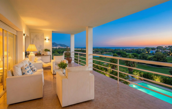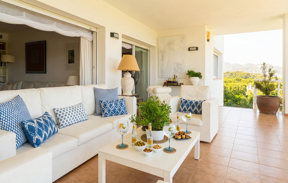 Chill-out area on the covered terrace: Comfortable outdoor furniture with white sofas and decorative cushions, perfect for relaxing in the shade or enjoying the views.