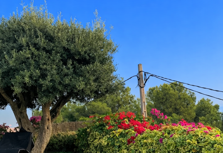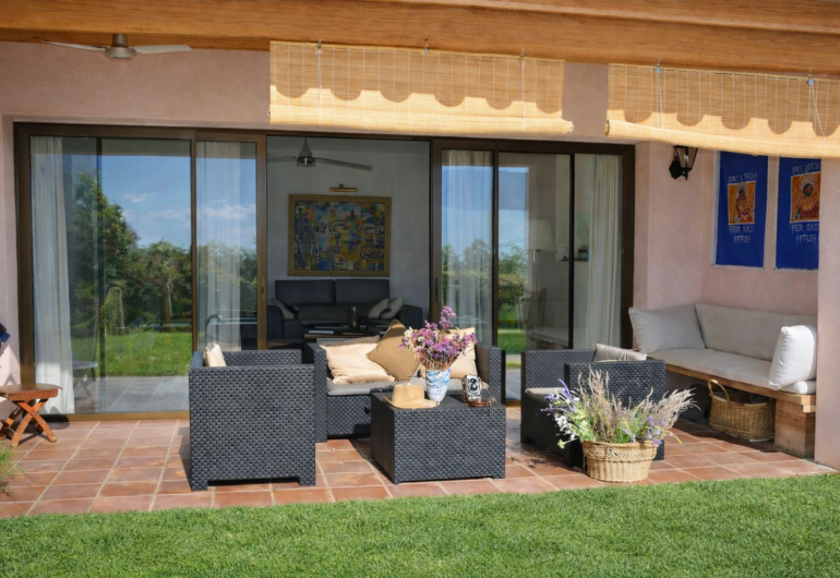 Outside, the villa features a beautiful garden full of color, with a majestic olive tree that provides natural shade and a private pool surrounded by six sun loungers. A chill-out porch completes the setting, ideal for long lunches, outdoor evenings or moments of absolute relaxation. Thanks to its orientation, the sun illuminates the exteriors throughout the day and offers magical sunsets over the Mediterranean.