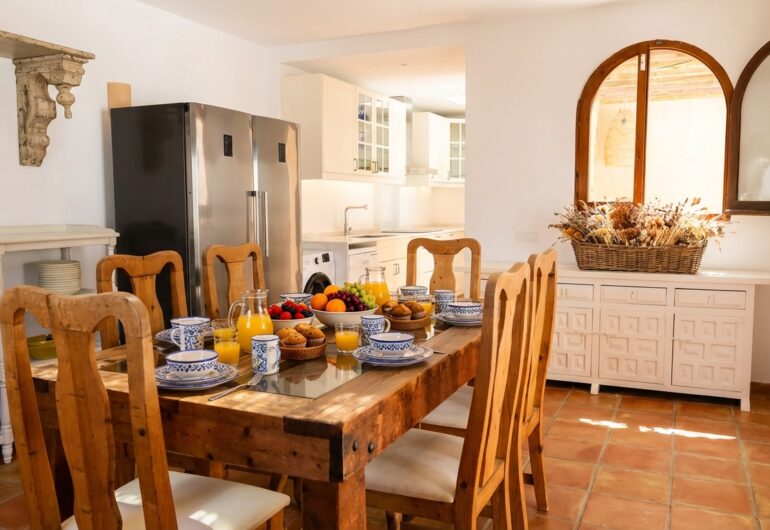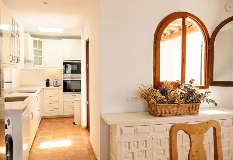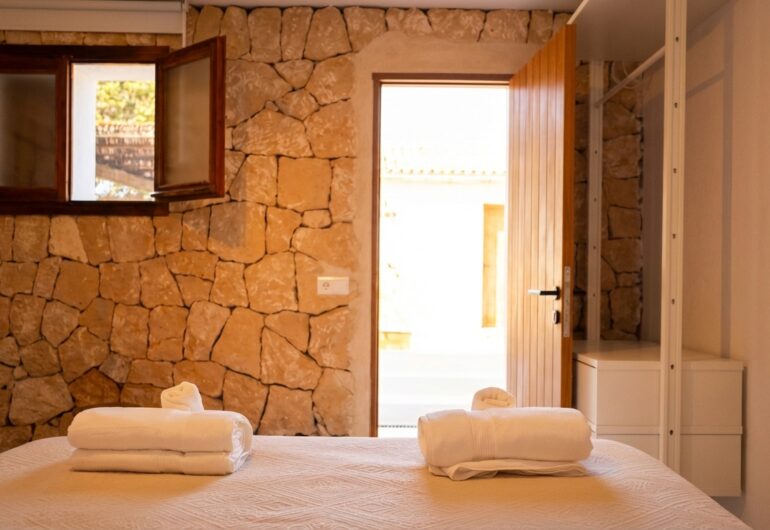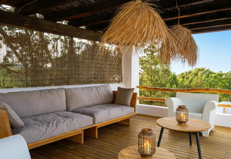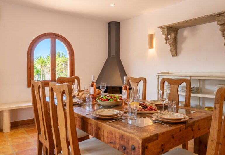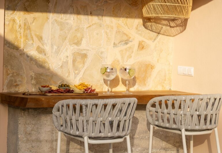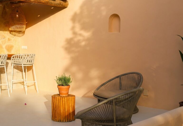 Villa Can Rafel has been completely renovated to preserve the charm of traditional Ibizan architecture while incorporating the highest standards of design and comfort. Its white-washed structure with thick walls and rounded shapes reflects the essence of the island’s typical houses, blending harmoniously with the natural surroundings.Every detail has been carefully thought out to offer a unique experience: from restored wooden beam ceilings to terracotta floors that keep the villa cool in summer. The indoor and outdoor spaces have been designed with elegant yet welcoming decor, using natural materials such as stone, wood, and handcrafted fibres to create a warm and relaxing atmosphere.